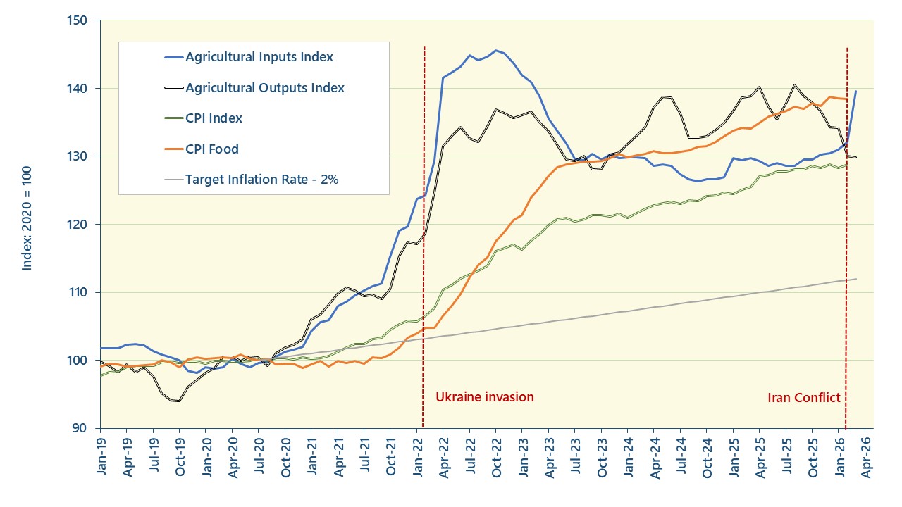 Agflation Update – April 2026 April 9, 2026 8:00 am Cost of Farm Squeeze Returns as Agflation Accelerates Andersons’ latest estimates (March 2026) placing it at 7.6% annually, well ahead of CPI (3.0%) and CPI Food (3.2%). This comes at a time when prices for agricultural outputs are falling, now 6.5% lower year-on-year. This highlights a clear ‘cost of farming’ squeeze that the sector is now facing. Agflation is now rising at its fastest rate since early 2022. While levels remain below the peaks seen following the Ukraine invasion, continued disruption linked to the Iran conflict, particularly around the Strait of Hormuz through which circa 20% of global oil and gas flows, still presents challenges for input costs. In contrast to 2022, when output prices rose alongside costs due to Black Sea supply disruption, current global grain and milk supplies remain ample. As a result, output prices are subdued, intensifying profitability pressure faced by UK farmers. This is especially evident in fertiliser costs, as around 30% of global urea supply, a key source of nitrogen fertiliser, is constrained by the Strait of Hormuz. The production of ammonium nitrate (another key source) is closely linked with gas prices. This has driven farm-gate nitrogen fertiliser prices to about £500 per tonne (where available). This presents immediate cost pressure, particularly for dairy systems with ongoing fertiliser demand through spring and summer. While most UK arable fertiliser has already been purchased, even with the temporary ceasefire announced on 7th April, exposure remains for later applications globally, notably in India and Latin America. Input pressures are not limited to fertiliser. Rising energy costs, including red diesel, are feeding through into machinery and contracting costs. A prolonged conflict would also risk broader inflationary spillovers, raising the prospect of renewed pressure on consumer demand and a wider cost-of-living squeeze. This could create challenges for red meat as prices for beef and lamb have risen markedly in recent years and are now substantially higher than pig meat and poultry meat prices. This points to a challenging outlook for UK farming, with margins under pressure from both sides at a time when support is declining in real terms. Farm businesses and agricultural professionals doing business with farmers need to be fully informed on the outlook for costs, markets and policy. The Andersons Spring Seminar, recorded at Harper Adams University in March 2026 and now available online, sets out the key drivers of farm profitability and the implications for those advising, supplying to, or procuring from the sector. To access the online seminar, visit: www.theandersonscentre.co.uk/seminars Figure 1: Andersons Annual ‘Agflation’, Agricultural Outputs & CPI Estimates – 2015 to 2026* Sources: ONS, Defra and The Andersons Centre Figure 2: Andersons ‘Agflation’ and UK Consumer Prices Index (CPI) – 2019 to 2026 Sources: ONS, Defra and The Andersons Centre Notes: Andersons’ Agflation estimates build upon Defra price indices for agricultural inputs and weights each input cost (e.g., animal feed) by the overall spend by UK farmers. Andersons then provides a more up-to-date estimate of the price index and annual inflationary trends for each input cost category. The Agricultural Outputs index is compiled in a similar manner. Defra price indices for agricultural outputs are weighted based on their overall contribution to UK farming output. Andersons then provides more recent estimates for each output category, with the index, and annual inflationary estimates, being updated as the official Defra data becomes available. * represents the % change versus the same month a year earlier. No. of Words 638 Authors Michael Haverty and Richard King Date 9th April 2026 This news release has been sent from The Andersons Centre, 3rd Floor, The Tower, Pera Office Park, Melton Mowbray, Leicestershire LE13 0PB. For further information please contact Michael Haverty (M:07900 907 902; Email: [email protected]), or Richard King (M: 07977 191 427; Email: [email protected]).