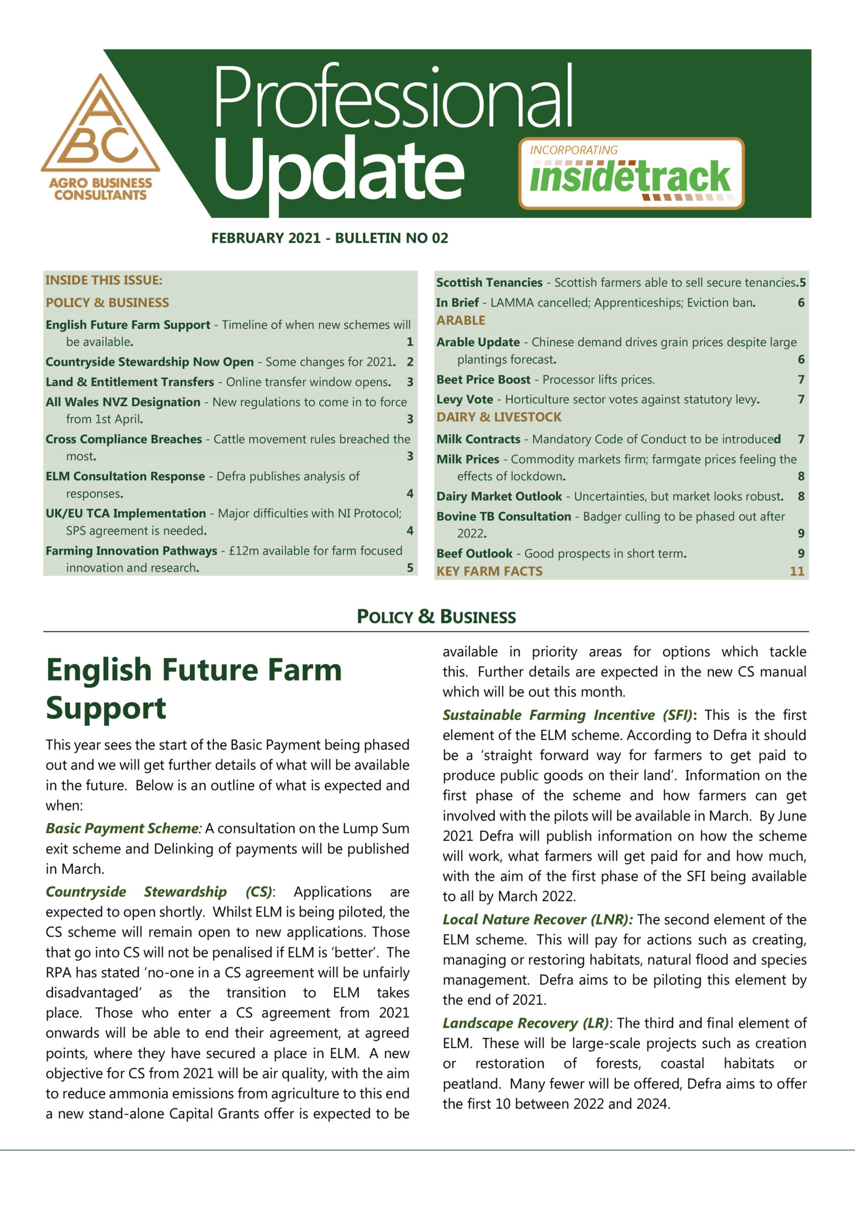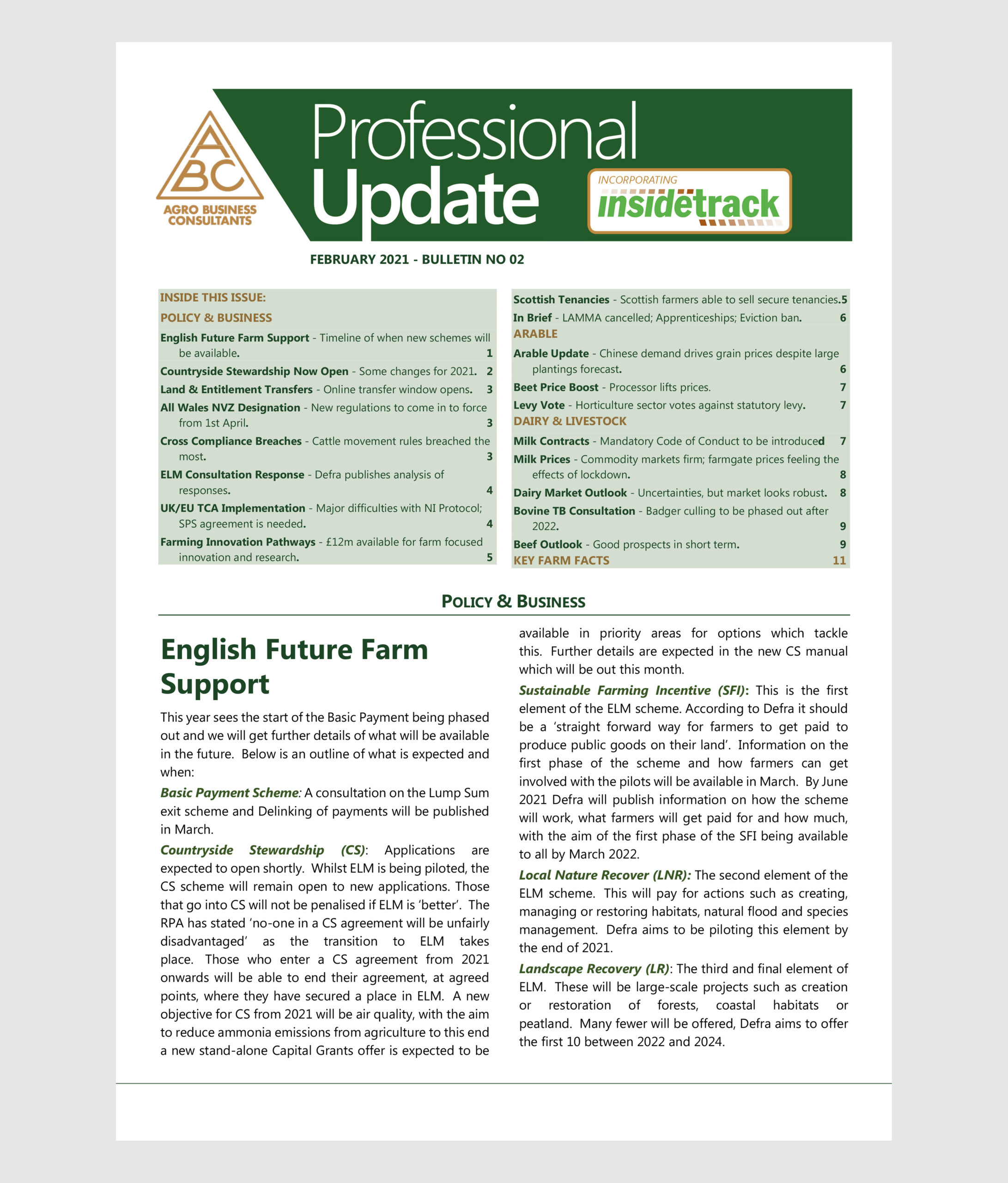 The Professional Update Bulletin provides knowledge and analysis on agricultural policy, markets, legislation, and farm profitability. It is used by hundreds of businesses trading with and advising farmers to keep informed of the latest industry developments.